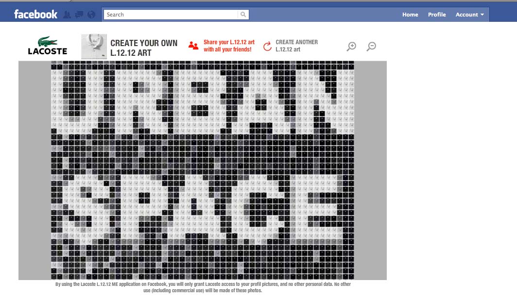 Lacoste launched an app on Facebook that you can "L.1212" yourself, hat means that you can place a photo and see that turn into a Lacoste L.1212 Polo art.
